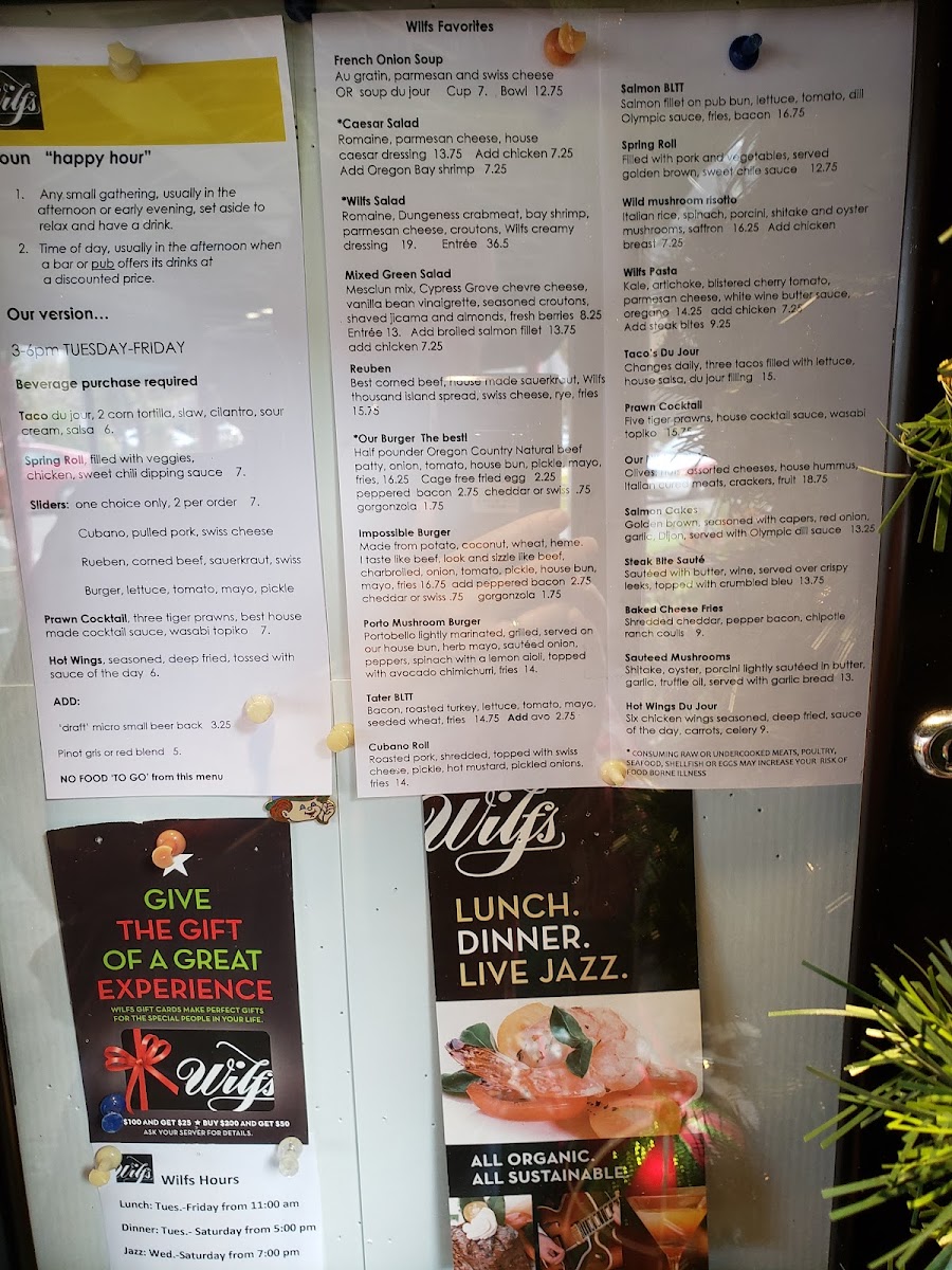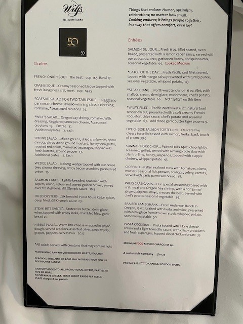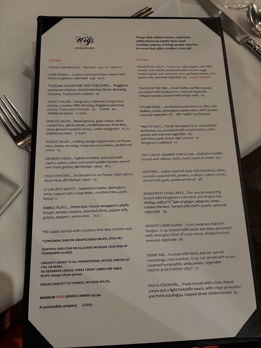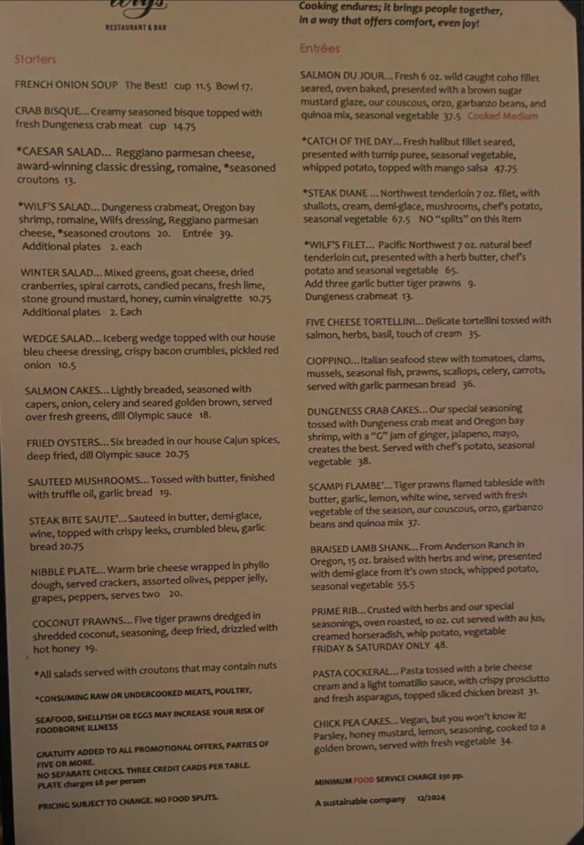 Oregon bay shrimp, romaine, Wilfs dressing, Reggiano parmesan cheese, seasoned croutons. Entrée 32. Additional plates 2 each